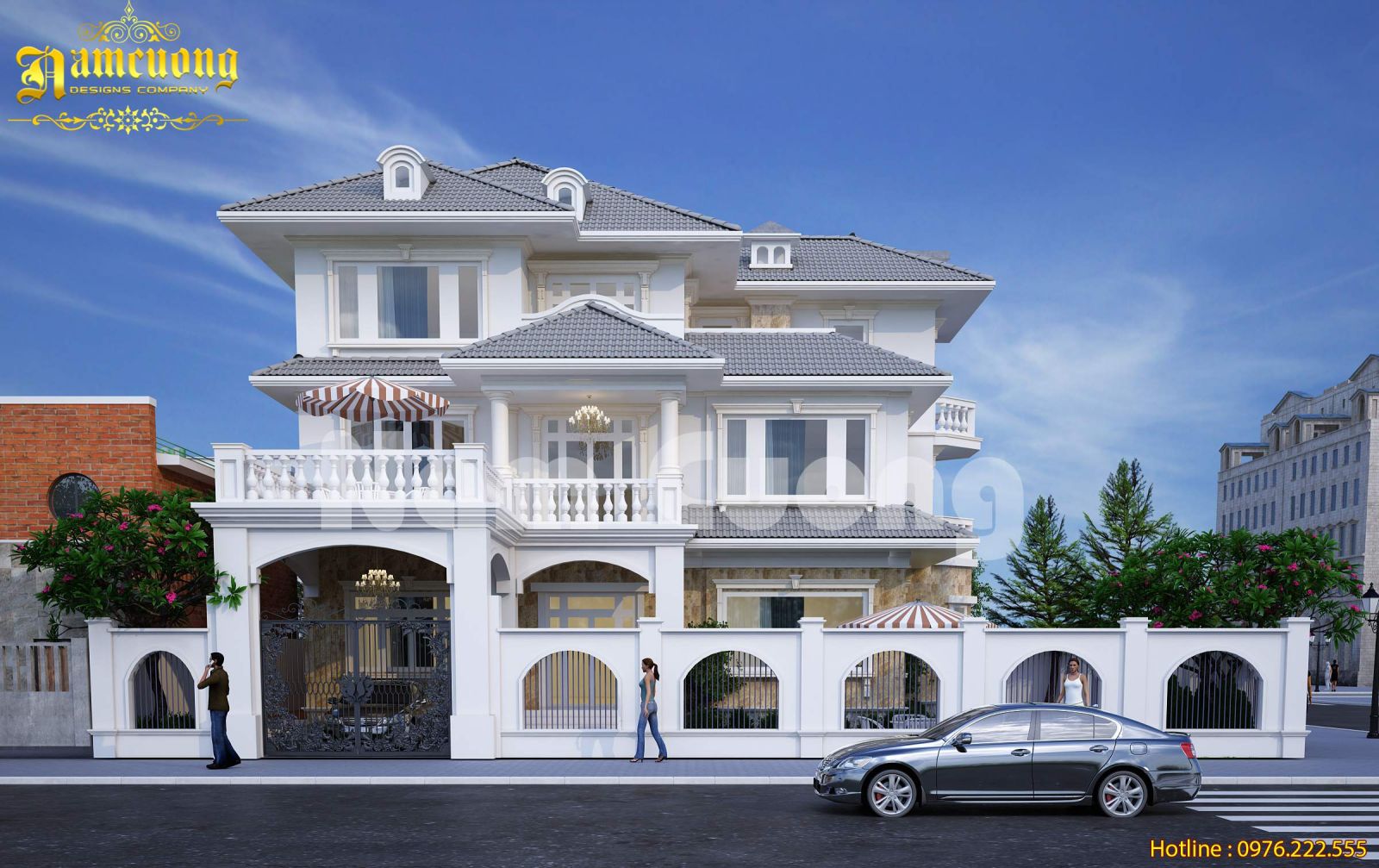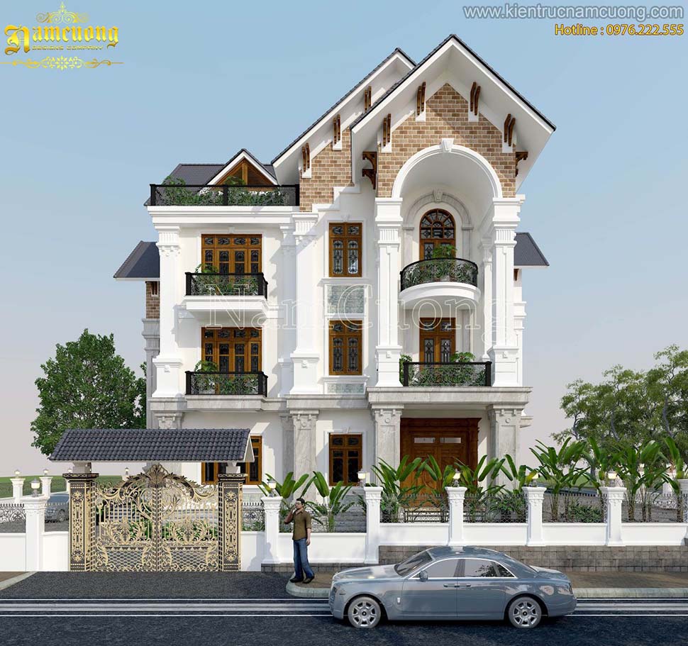 Công trình gây ấn tượng mạnh mẽ nhờ sự phá cách trong thiết kế, khi khéo léo kết hợp phong cách tân cổ điển và kiến trúc châu Âu để tạo nên vẻ đẹp độc đáo, sang trọng và khác biệt hoàn toàn. Biệt thự được nâng cao hơn mặt đất khoảng 2,5m, phần không gian bên dưới được tận dụng thông minh làm gara ô tô và kho chứa tiện dụng.