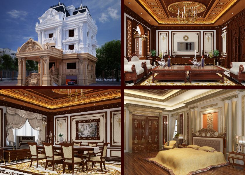 - Biệt thự cổ điển: Lấy cảm hứng từ kiến trúc hoàng gia với hoa văn, phào chỉ cầu kỳ và bố cục đăng đối, thể hiện đẳng cấp và vị thế của chủ nhân.