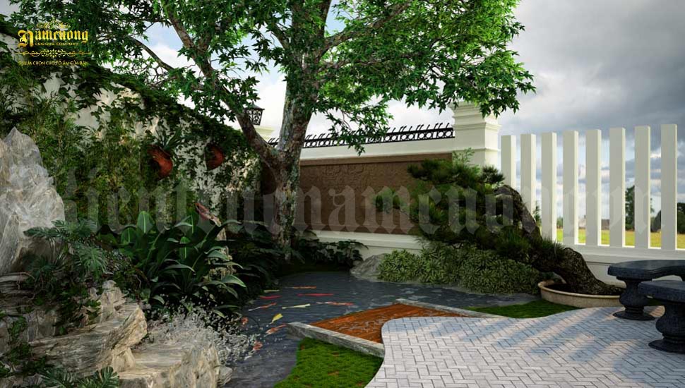 Về không gian ngoại cảnh, vì ngôi biệt thự 3 tầng hình chữ L của gia đình anh Định được xây dựng trên nền đất rộng rãi, nên kiến trúc sư Nam Cường đã thiết kế hệ thống sân vườn bao gồm hòn non bộ, cây xanh, hồ cá…