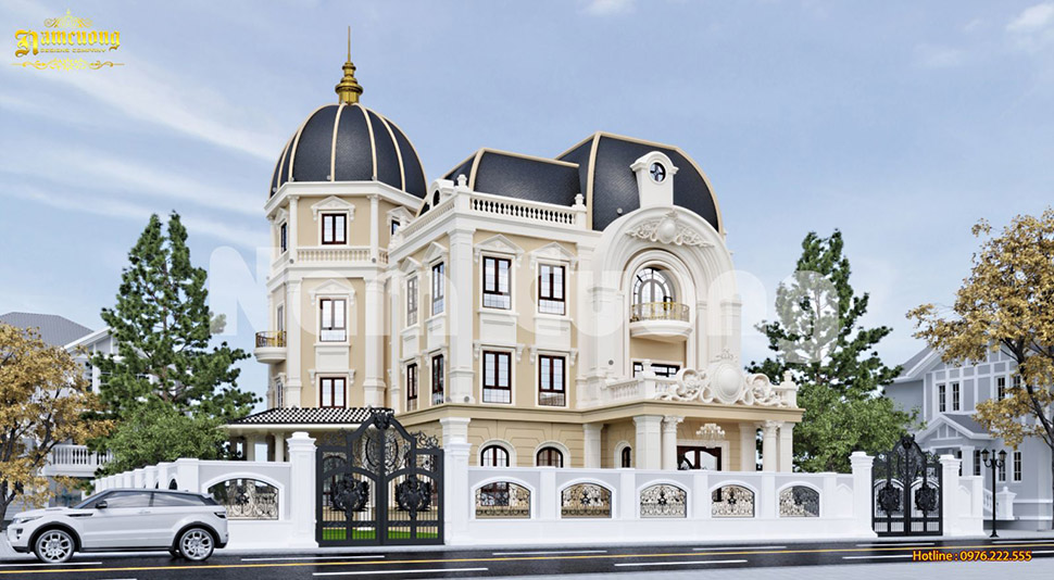 Biệt thự lâu đài 4 tầng mái vòm gây ấn tượng mạnh với phần mái bo tròn mềm mại, mang đậm tinh thần kiến trúc cung điện Châu Âu. Kiểu mái này thường được đặt tại trung tâm công trình hoặc sảnh chính, tạo điểm nhấn quyền uy và sang trọng.
