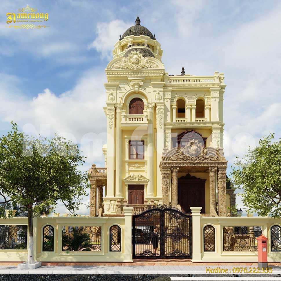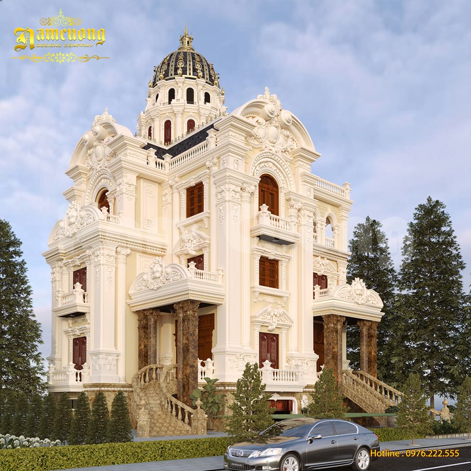 Chi tiết trang trí tinh xảo: Hệ cột lớn, phào chỉ, phù điêu, mái vòm, ban công nghệ thuật được xử lý cầu kỳ, đòi hỏi trình độ thiết kế và thi công cao.