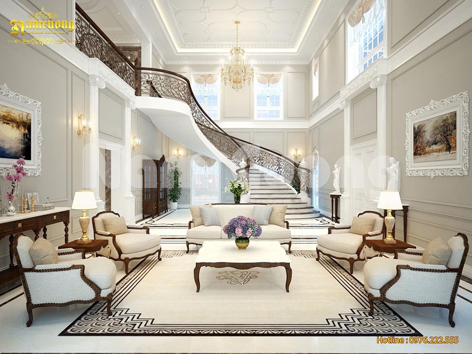 Phòng khách là không gian trung tâm, là nơi tiếp khách nên cần thể hiện rõ nhất đẳng cấp và tạo dấu ấn riêng. Thiết kế phòng khách thường có trần cao, sảnh lớn, hệ cột trang trí và nội thất cao cấp như sofa bọc da, đá marble, đèn chùm pha lê.