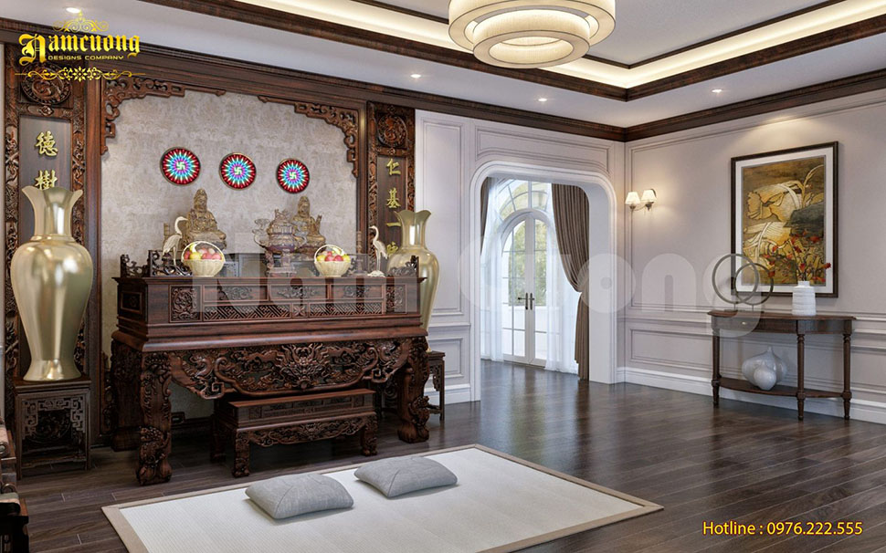 Phòng thờ trong biệt thự lâu đài 4 tầng thường được bố trí ở tầng cao nhất, đảm bảo sự yên tĩnh và trang nghiêm. Nội thất sử dụng gỗ tự nhiên cao cấp, chạm khắc tinh xảo, kết hợp ánh sáng trầm ấm tạo cảm giác linh thiêng.