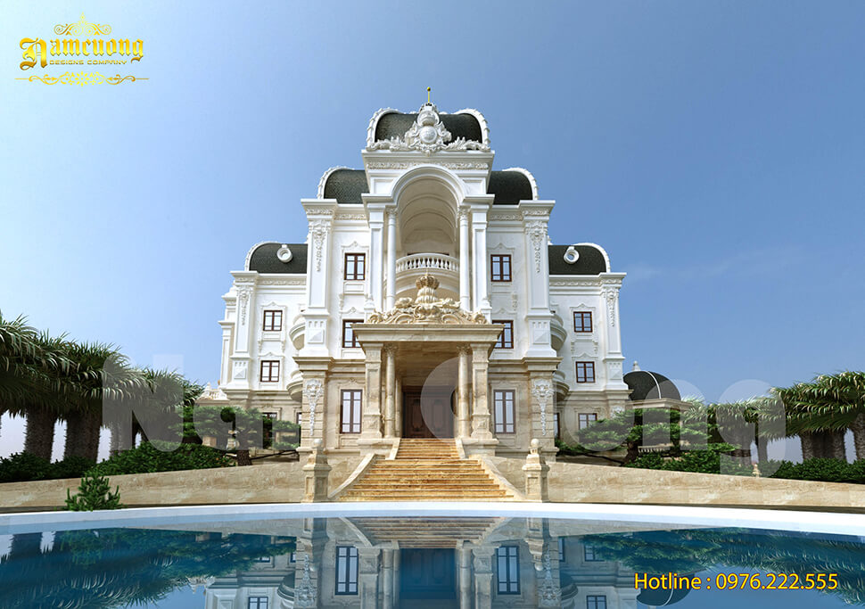 Gam màu chủ đạo thường là trắng kem, vàng nhạt hoặc be sang, gợi cảm giác thanh lịch và trang nhã. Những mảng tường lớn được xử lý tinh tế giúp tổng thể vừa mềm mại, vừa mạnh mẽ. Mái vòm hoặc mái Mansard được xem là điểm nhấn đặc trưng cho phong cách hoàng gia, mang lại sự cân đối và tạo nên dáng vẻ kiêu sa cho công trình giữa lòng đô thị.