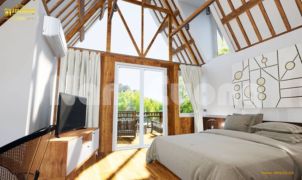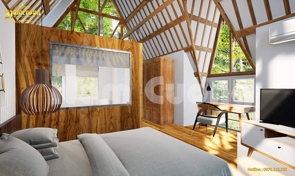- Ánh sáng tự nhiên được sử dụng phù hợp trong không gian bungalow sẽ giúp cho căn phòng trở nên thoáng mát, dễ chịu hơn bao giờ hết. Bên cạnh đó, bạn có thể sử dụng đèn hắt, đèn led, đèn thả treo trần, điều này sẽ khiến cho du khách cảm thấy thoải mái khi nghỉ ngơi tại đây.