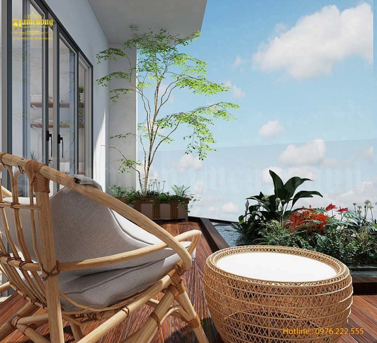Sau khi dành phần diện tích vuông vắn để thiết kế phòng ngủ, kiến trúc sư Nam Cường đã tận dụng góc nhọn còn lại để thiết kế ban công. Nơi đây đặt một bộ bàn ghế bằng tre, trải đệm êm ái cho chỗ ngồi dễ chịu hơn.
