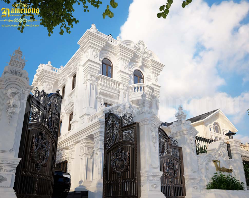 Các gam màu sử dụng trong ngoại thất đều kết hợp hài hòa, tương đồng với nhau. Cánh cửa đúc đồng màu vàng đặc trên nền trắng tạo nên nét ấn tượng, nổi bật. Tường rào bao quanh căn biệt thự cũng được sơn phủ màu trắng sang chảnh. Bức phù điêu khắc tên của biệt thự được chạm khắc hoa văn đẹp không tì vết. Trên tường kết hợp trồng các loại cây hoa, cây xanh để giúp không gian trở nên ấm áp, gần gũi với thiên nhiên.