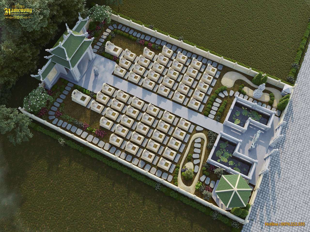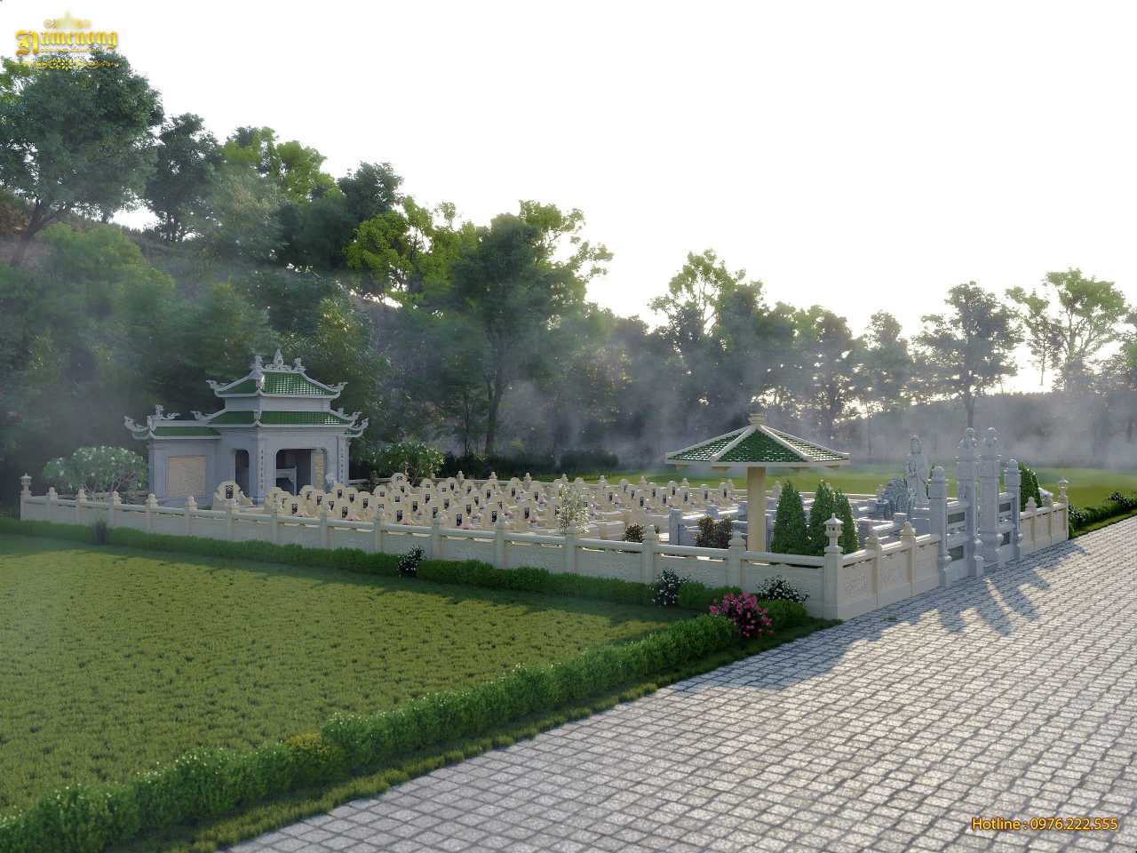 Thiết kế lăng mộ gia đình quy mô lớn đòi hỏi sự tính toán tỉ mỉ về bố cục, kiến trúc và phong thủy để tạo nên một công trình hoàn hảo. Chị Trang đã tin tưởng lựa chọn Kiến Trúc Nam Cường để thiết kế khu lăng mộ rộng 460m2 cho dòng họ. Các kiến trúc sư đã tư vấn và hoàn thiện bản vẽ 3D với đầy đủ các thành phần kiến trúc chuẩn phong thủy như sau: